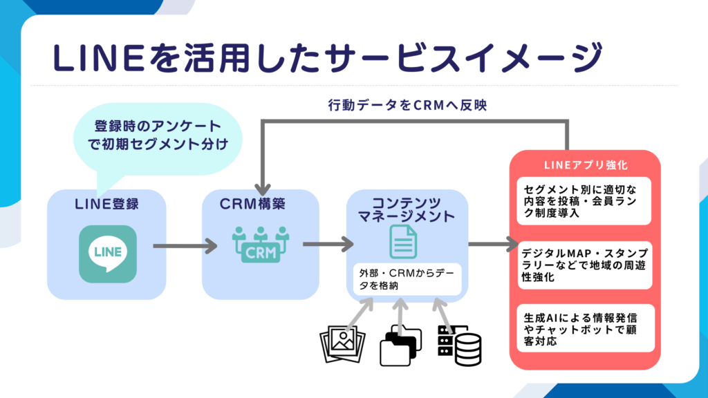 - 顧客データベースとLINEを連携することで、会員限定情報やクローズドの情報などを提供できる仕組みを作ります(オプション)